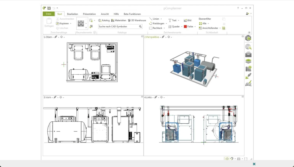 Kundenplanungen wurden mit einer Software erstellt, die eigentlich für die Konstruktion von Kompressoren gedacht war. Das führte zu Ø 6 Stunden Zeitaufwand pro Planung. Besonders aufwändig war dabei die Darstellung des Rohrleitungsverlaufs zwischen den einzelnen Kompressoren.
